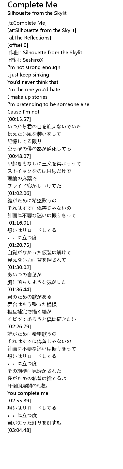 | [00:00.00] | 作曲 : Silhouette from the Skylit |