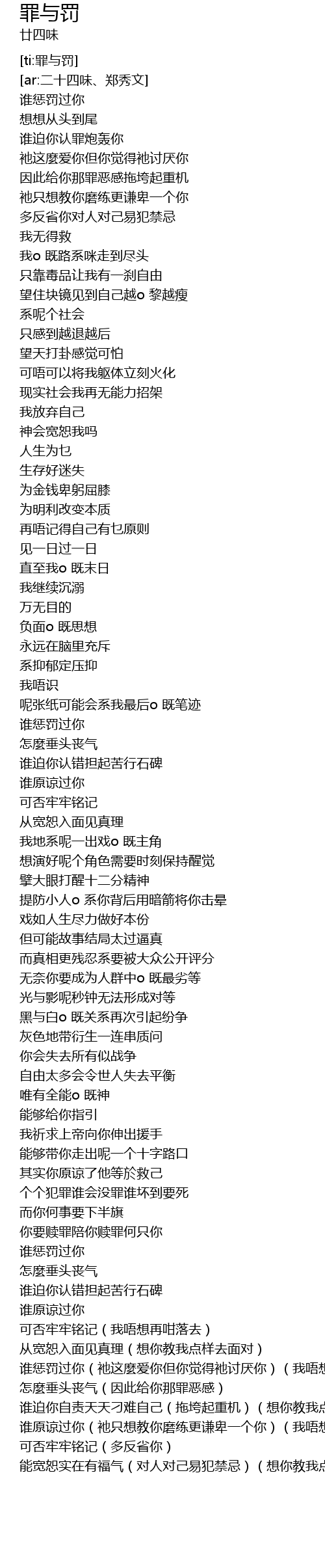 | [03:26.713] | 谁原谅过你(衪只想教你磨练更谦卑一个你)(我唔想再咁落去) |