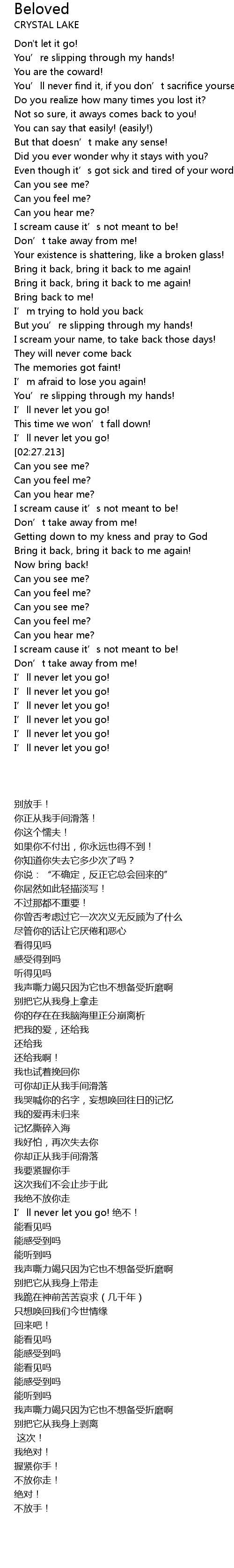 | [02:43.775] | I scream cause it' s not meant to be! |
