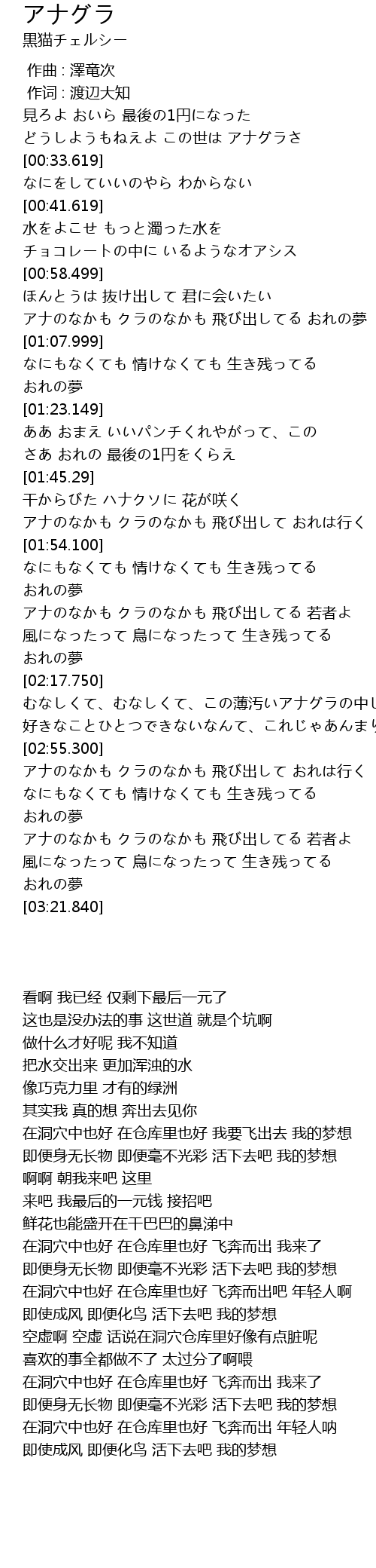 | [03:00.400] | なにもなくても 情けなくても 生き残ってる おれの夢 |