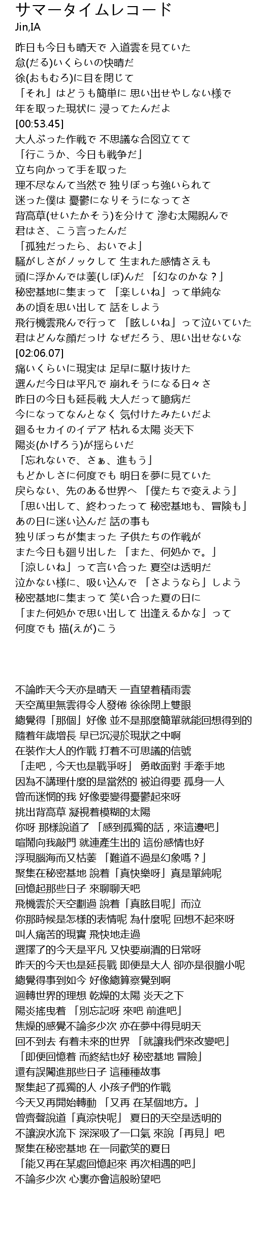 | [02:45.90] | 廻るセカイのイデア 枯れる太陽 炎天下 |