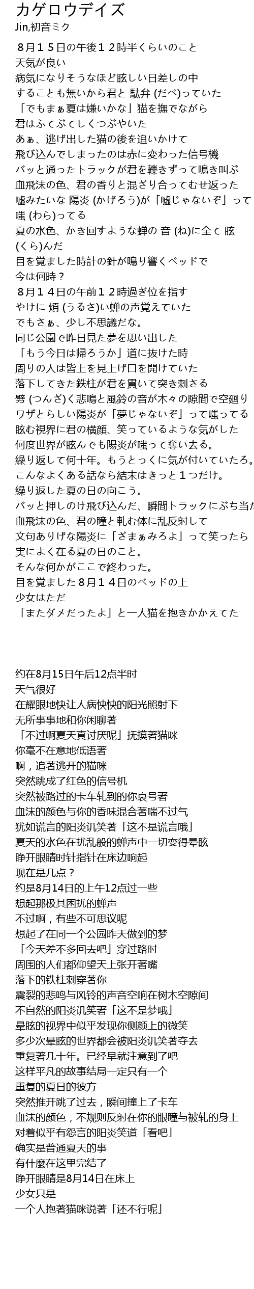 | [03:31.91] | 目を覚ました8月14日のベッドの上 |
