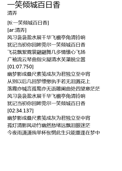 | [02:25.783] | 犹记当初你回眸莞尔一笑倾城百日香 |