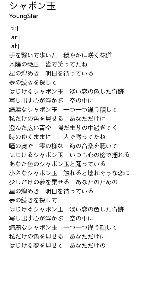 | [02:52.55] | はじけるシャボン玉 いつも心の傍で揺れる |