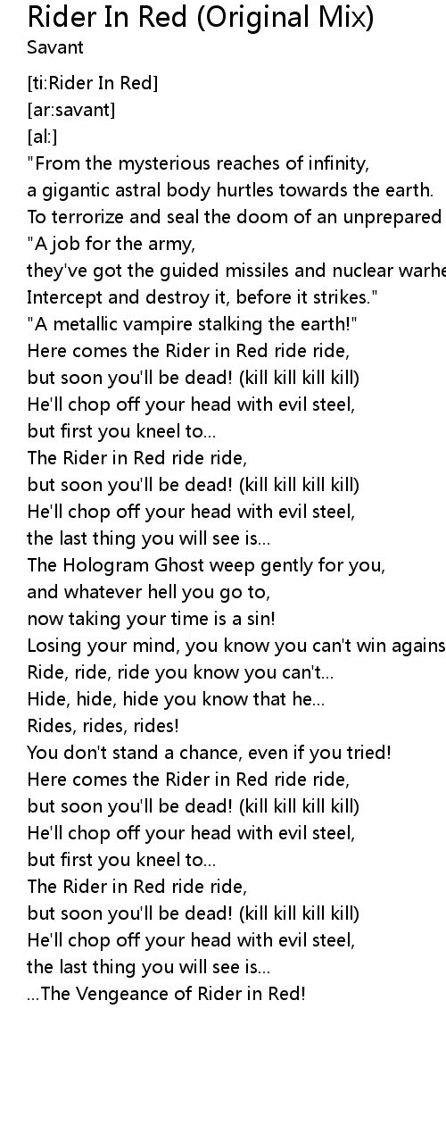 | [01:31.21] | Here comes the Rider in Red ride ride, |