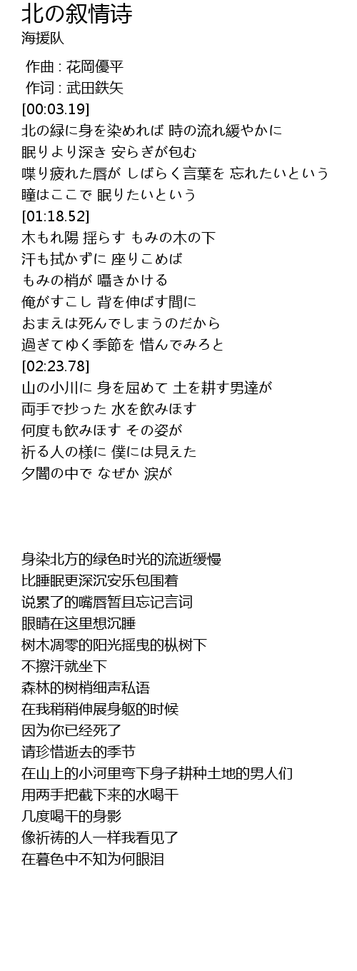 | [00:18.87] | 北の緑に身を染めれば 時の流れ緩やかに |