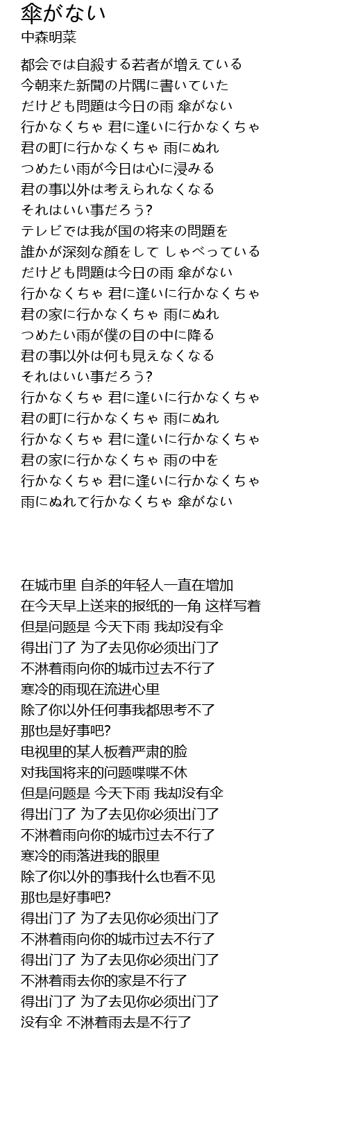 | [01:10.41] | だけども問題は今日の雨 傘がない |