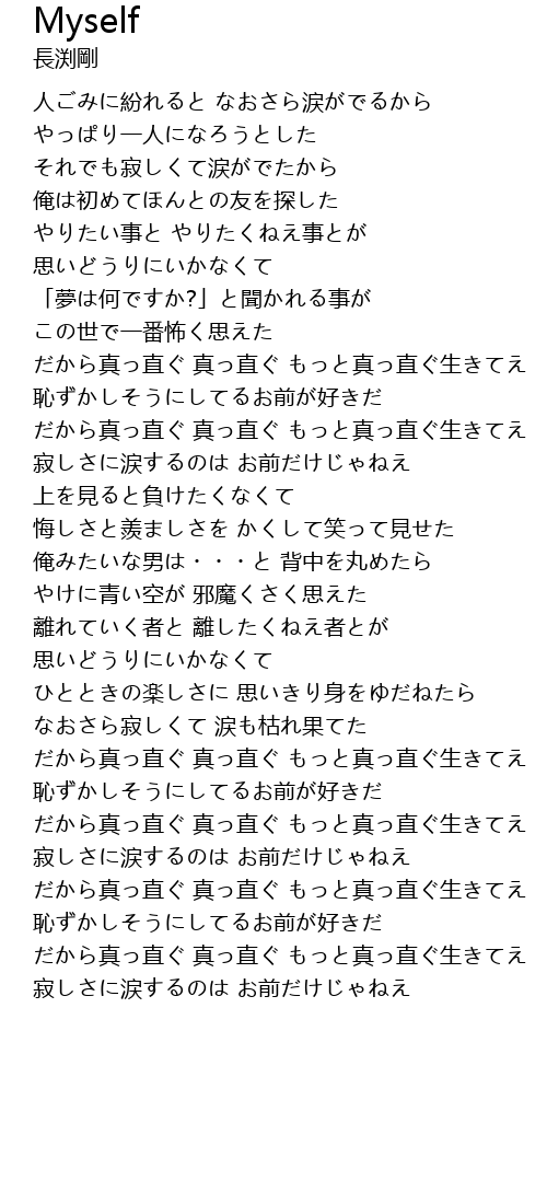 | だから真っ直ぐ 真っ直ぐ もっと真っ直ぐ生きてえ | |