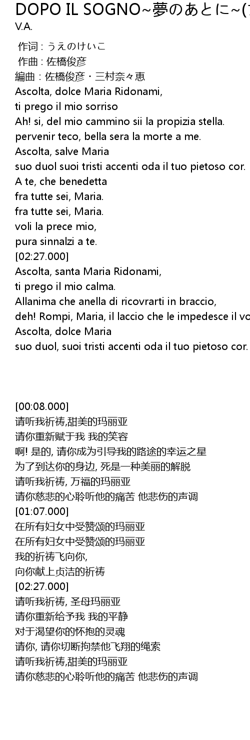 | [00:18.000] | Ascolta, dolce Maria Ridonami, |