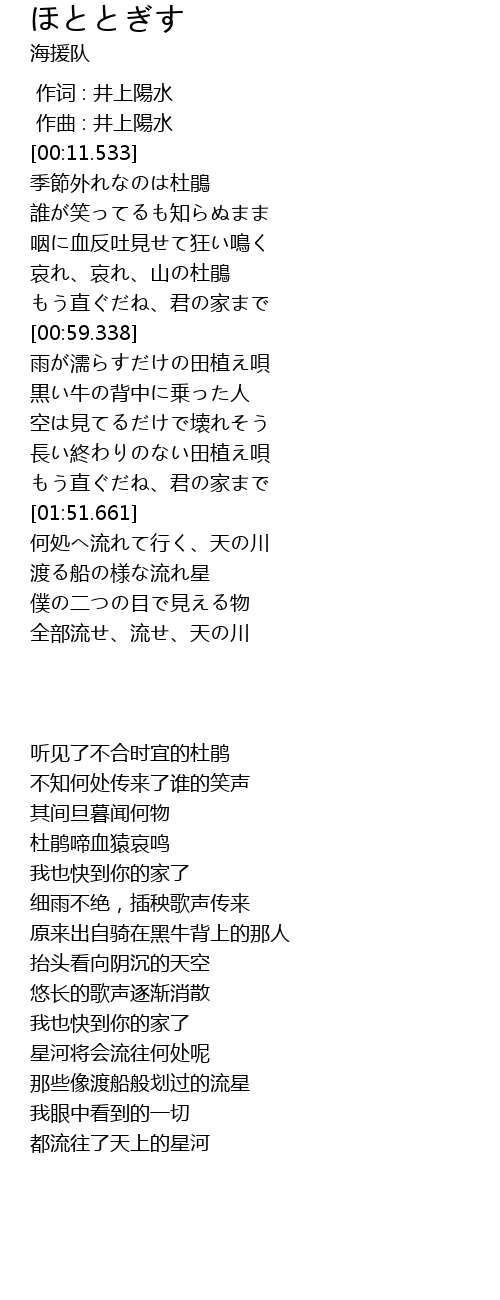 | [00:16.340] | 季節外れなのは杜鵑 |