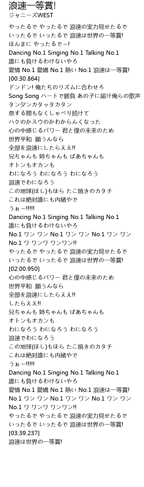 | [03:14.775] | 愛情 No.1 愛嬌 No.1 熱い No.1 浪速は一等賞! |