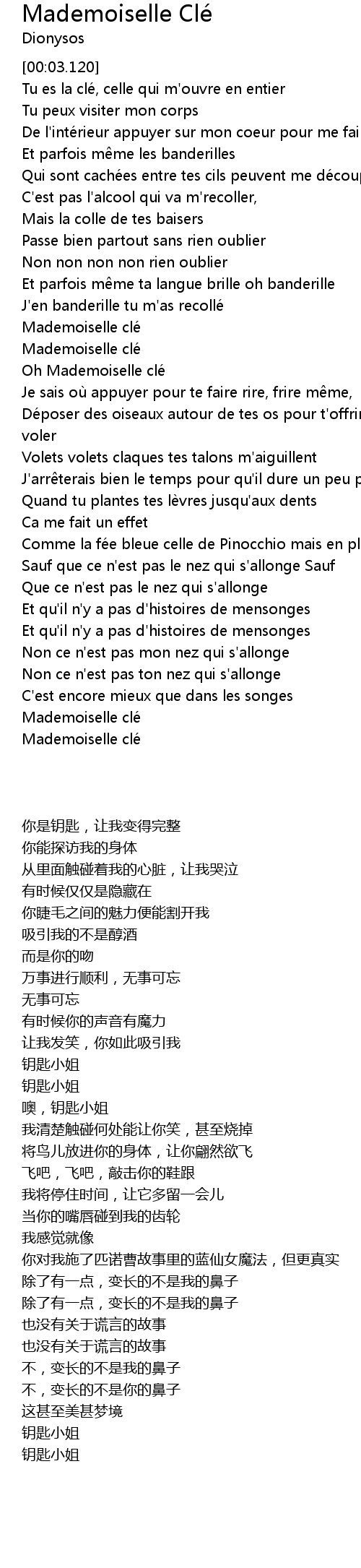 | [00:08.420] | Tu es la clé, celle qui m' ouvre en entier |