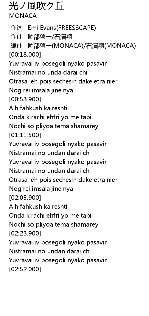 | [00:02.000] | 编曲 : 岡部啓一(MONACA)/石濱翔(MONACA) |