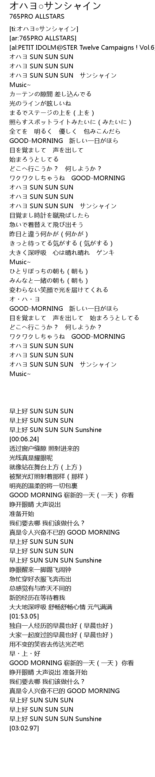 | [00:03.33] | オハヨ SUN SUN SUN サンシャイン |