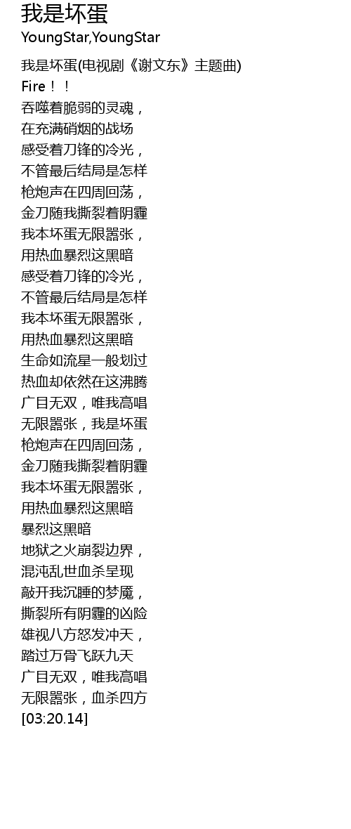| [00:03.34] | 我是坏蛋(电视剧《谢文东》主题曲) |