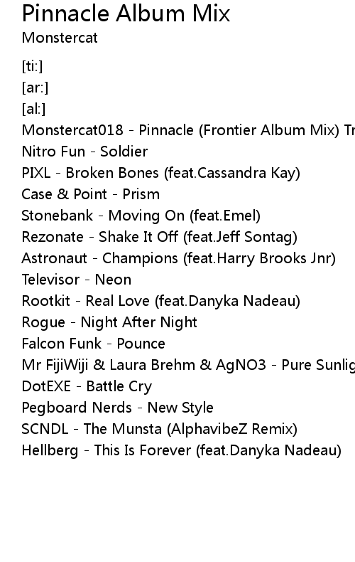 Monstercat018 - Pinnacle (Frontier Album Mix) Tracklist: |