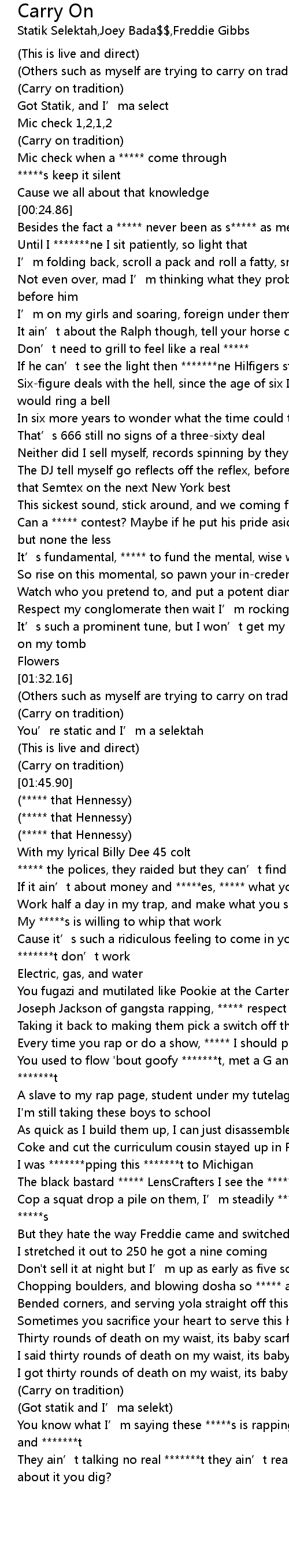 | [03:16.72] | You know what I’m saying these *****s is rapping around in circles and *******t |