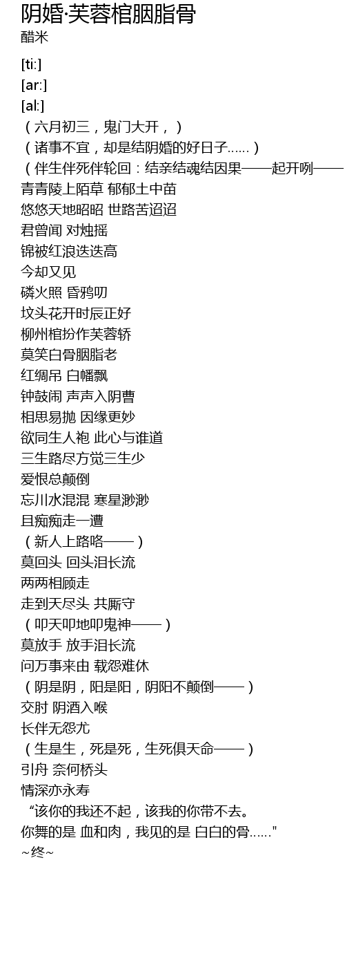 | [00:09.82] | (伴生伴死伴轮回:结亲结魂结因果——起开咧——) |