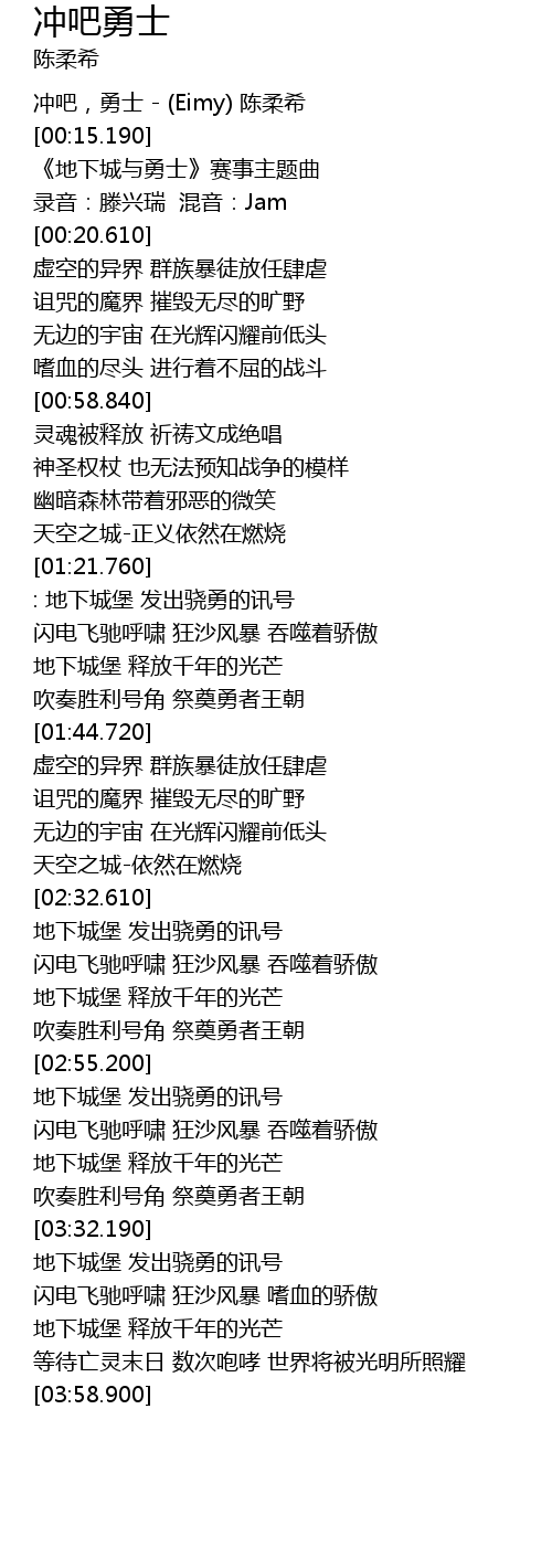 | [00:14.360] | 冲吧,勇士 - (Eimy) 陈柔希 |