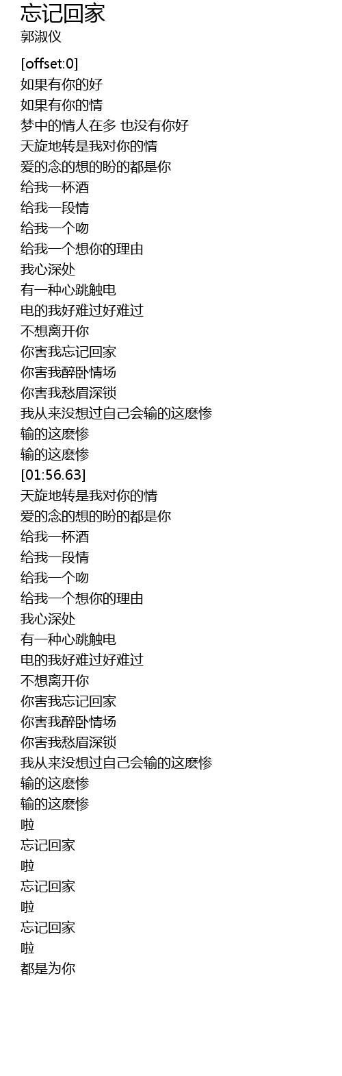 | [01:30.01] | nǐ hài wǒ wàng jì huí jiā |