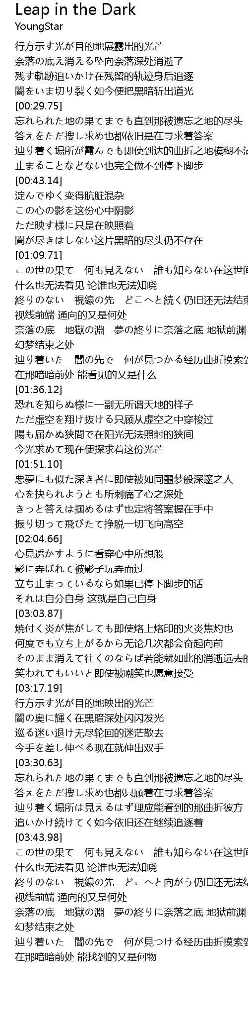 | [04:03.78] | 辿り着いた 闇の先で 何が見つける经历曲折摸索到达 在那喑暗前处 能找到的又是何物 |