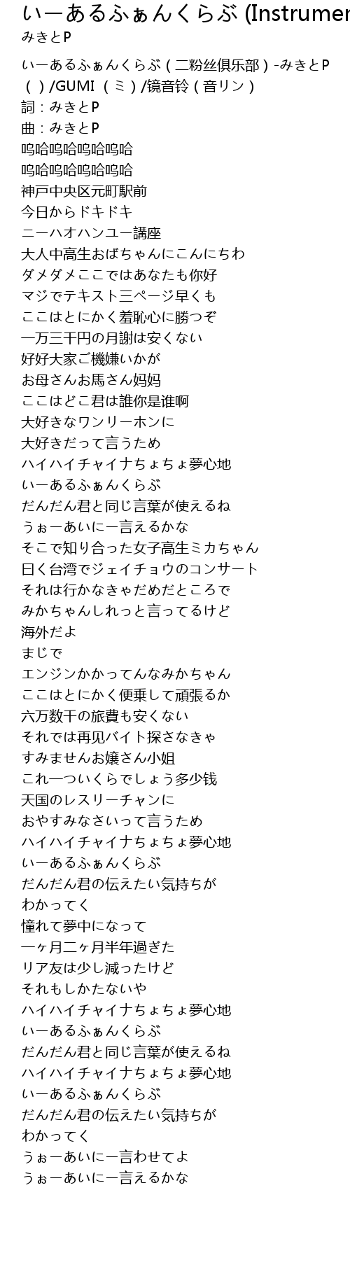 | [00:00.00] | いーあるふぁんくらぶ(二粉丝俱乐部)-みきとP ()/GUMI (ミ)/镜音铃(音リン) |