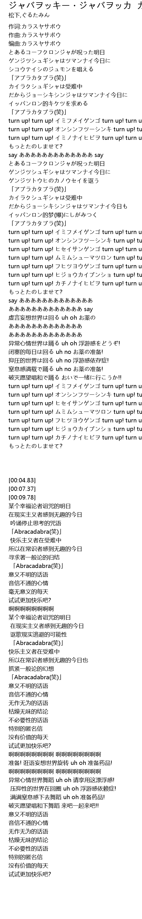 | [00:41.46] | turn up! turn up! イミフメイゲンゴ turn up! turn up! |