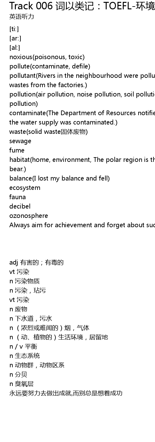 | [00:23.32] | pollutant(Rivers in the neighbourhood were polluted by the chemical wastes from the factories.) |