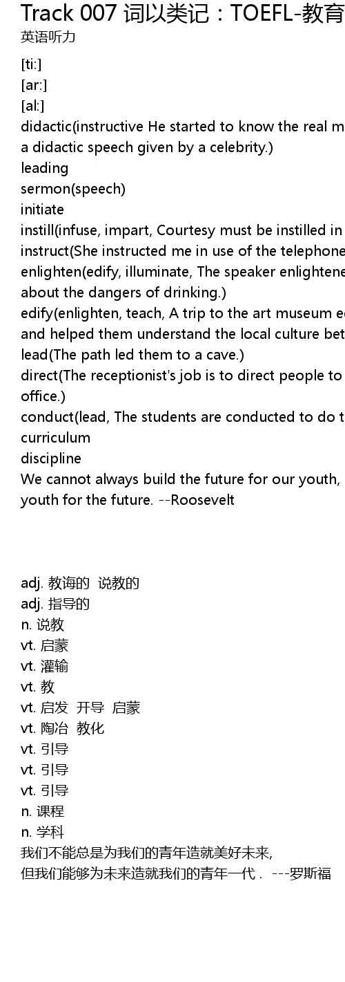 | [00:13.40] | didactic(instructive He started to know the real meaning of life from a didactic speech given by a celebrity.) |