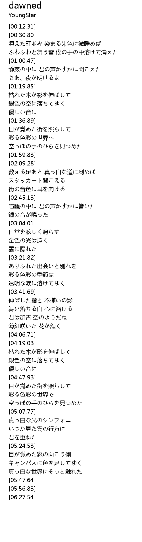 | [05:38.67] | 真っ白な世界にそっと触れた |