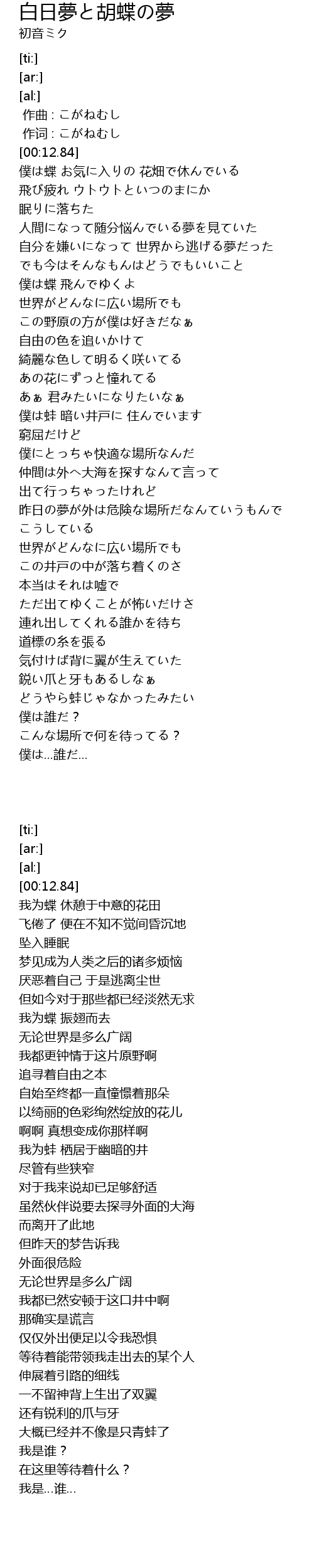 | [00:24.65] | 僕は蝶 お気に入りの 花畑で休んでいる |
