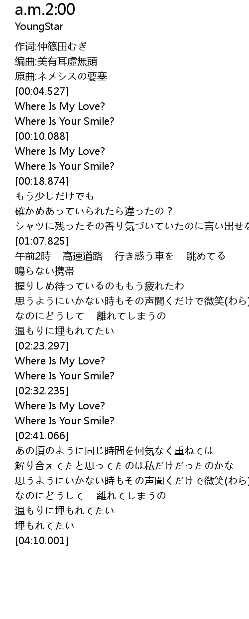 | [03:43.147] | なのにどうして 離れてしまうの 温もりに埋もれてたい |