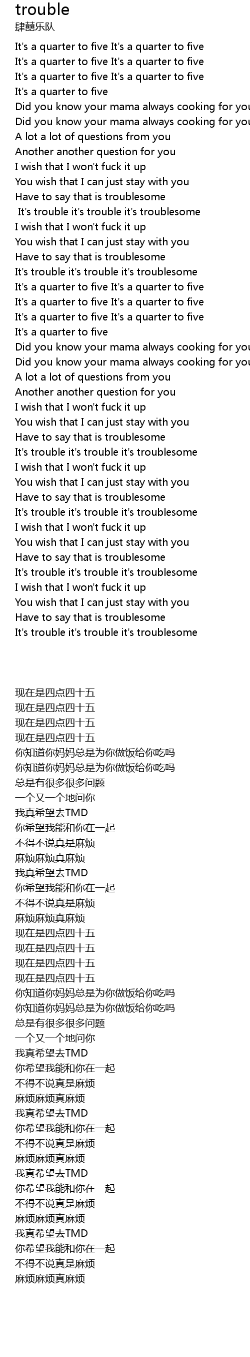 | [04:26.96] | It's trouble it's trouble it's troublesome |