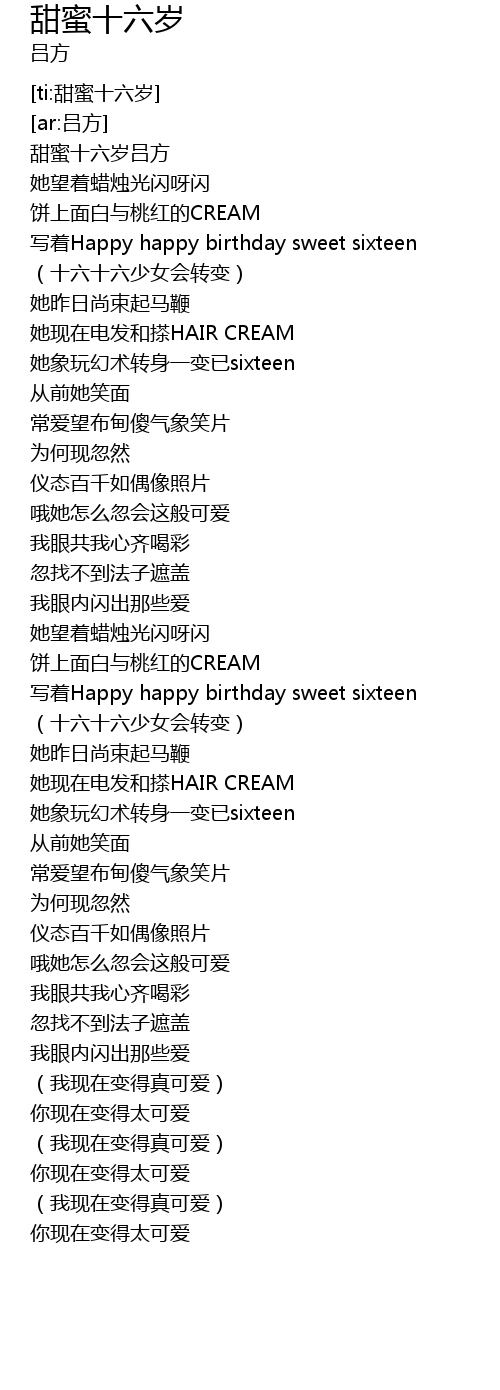 | [00:23.364] | xiě zhe Happy happy birthday sweet sixteen |