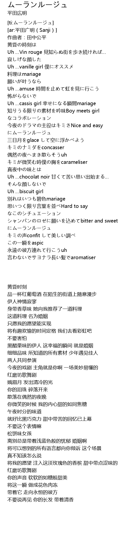 | [03:42.908] | シャンパンのロゼに願いを込めてbitter and sweet にムーランルージュ |