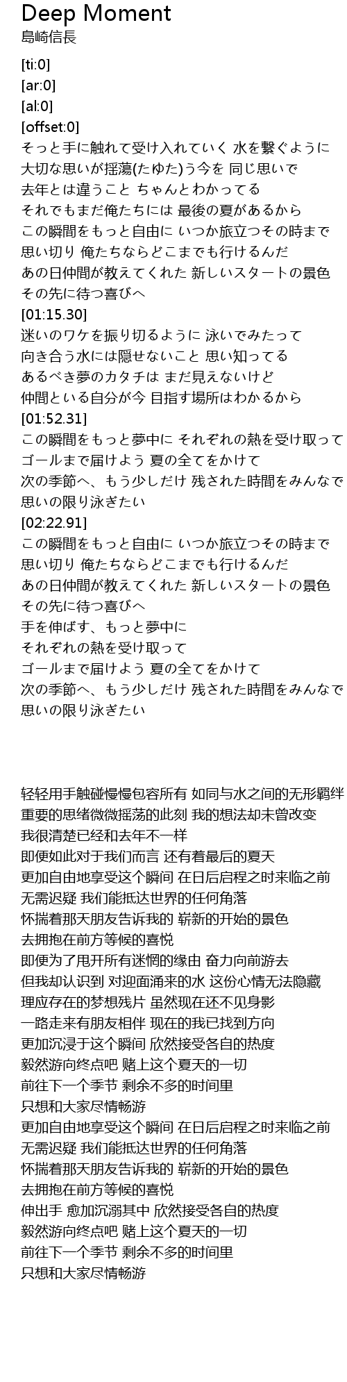 | [01:52.88] | この瞬間をもっと夢中に それぞれの熱を受け取って |