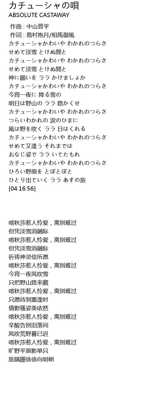 | [00:56.80] | カチューシャかわいや わかれのつらさ |