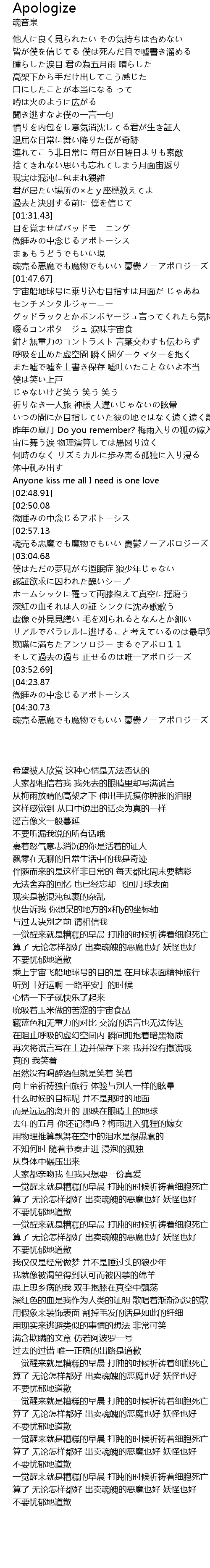 | [04:45.67][04:30.73][04:15.63][04:00.63] | まぁもうどうでもいい現 魂売る悪魔でも魔物でもいい 憂鬱ノーアポロジーズ |