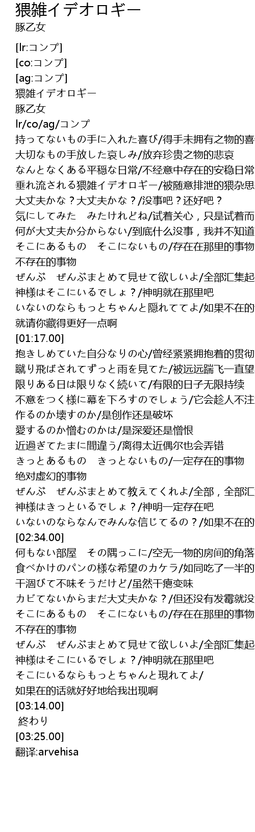 | [00:35.00] | 垂れ流される猥雑イデオロギー/被随意排泄的猥杂思想 |