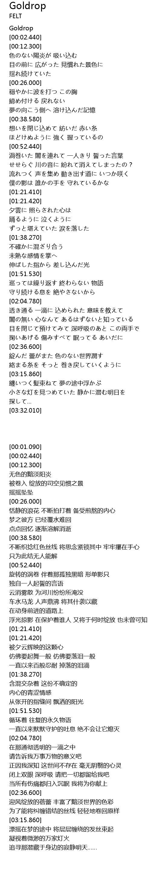| [02:07.320] | 透き通る 一滴に 込められた 意味を教えて |