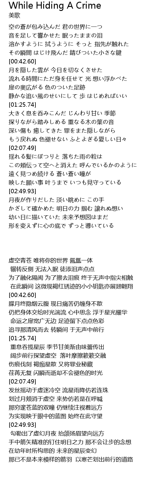 | [01:46.91] | 深い傷も 癒してきた 罪をまた隠しながら |