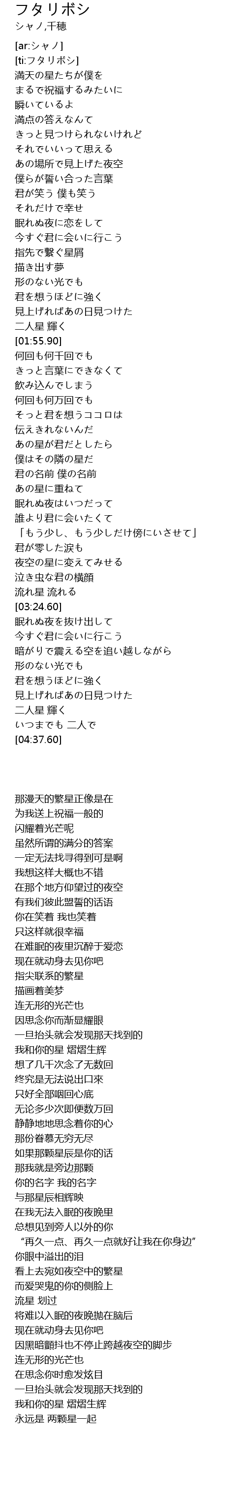| [01:27.48] | 指先で繋ぐ星屑 |