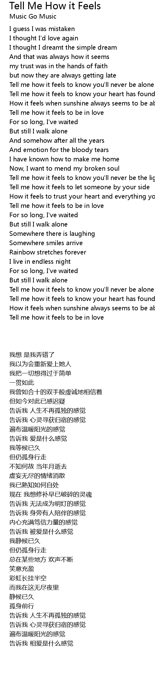 | [00:49.011] | Tell me how it feels to know your heart has found a home |