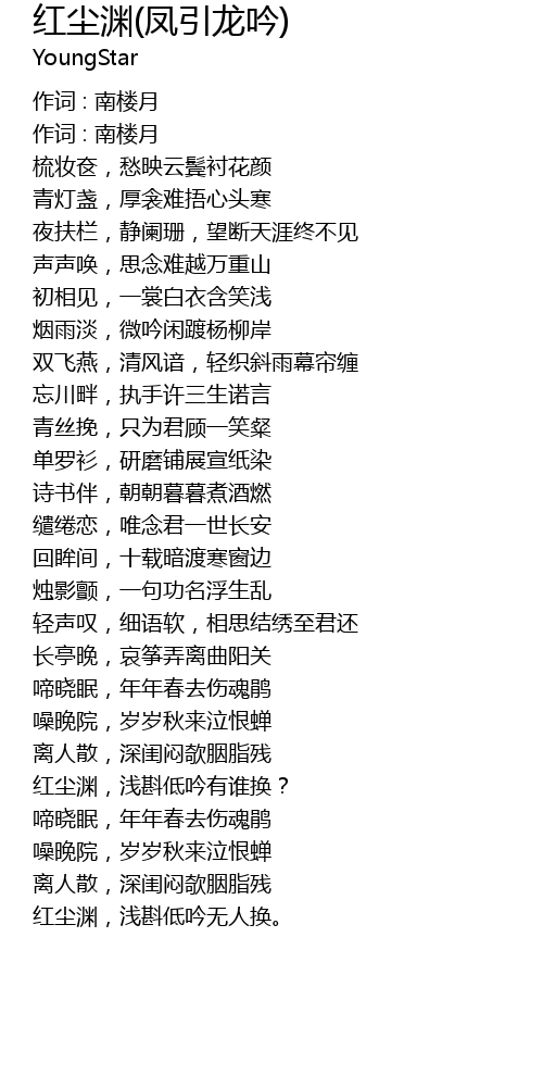 | [04:14.560] | hóng chén yuān, qiǎn zhēn dī yín wú rén huàn. |