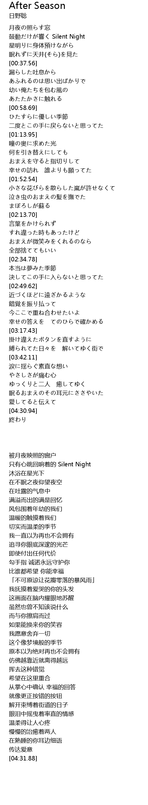 | [00:21.34] | 鼓動だけが響く Silent Night |