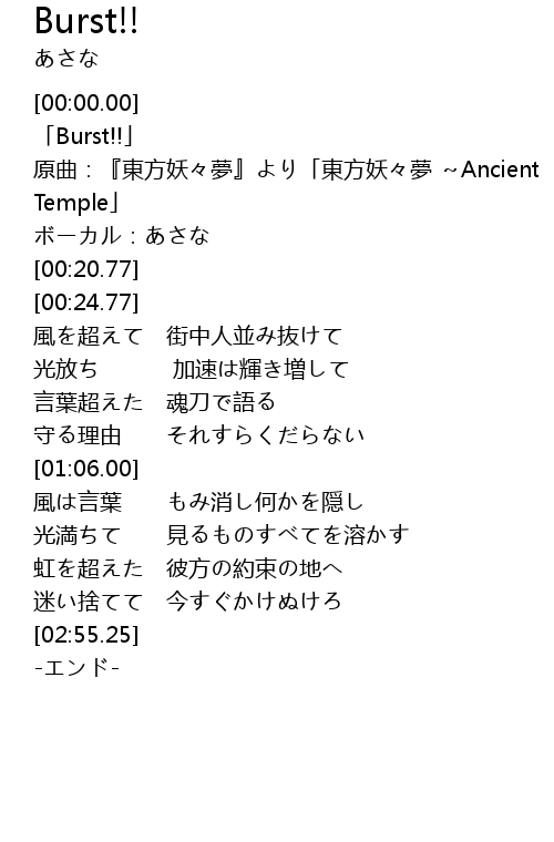 | [00:04.77] | 原曲:『東方妖々夢』より「東方妖々夢 ~Ancient Temple」 |