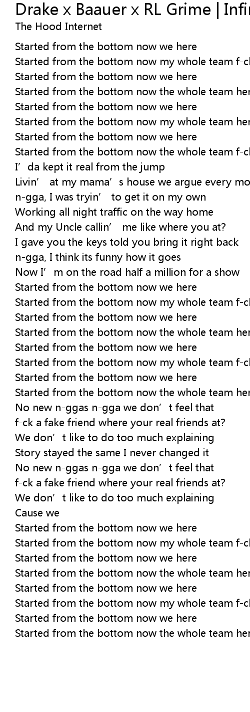 | [01:47.14] | Started from the bottom now the whole team here n-gga |