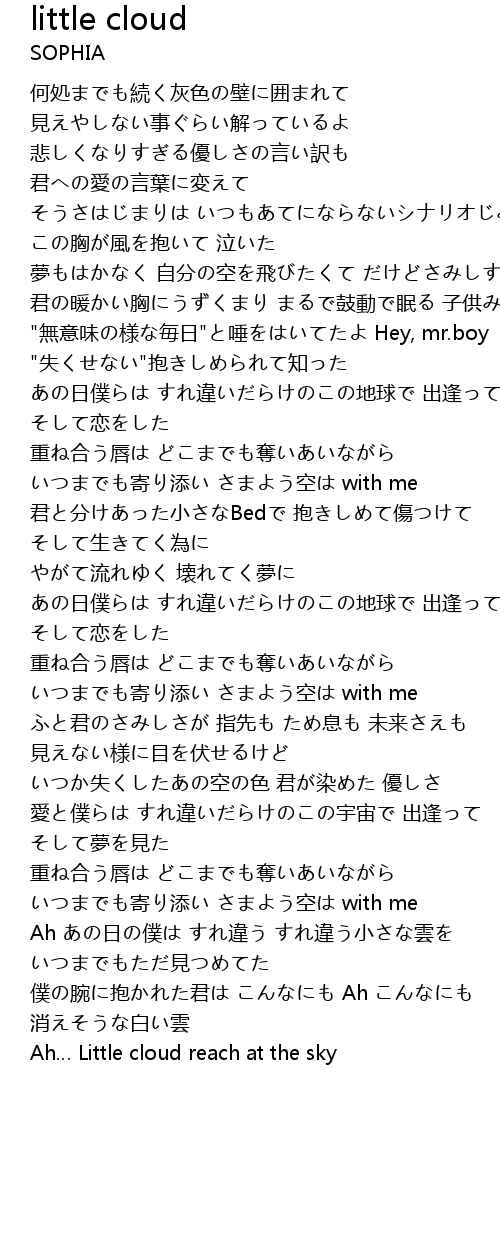 | Ah あの日の僕は すれ違う すれ違う小さな雲を いつまでもただ見つめてた | |