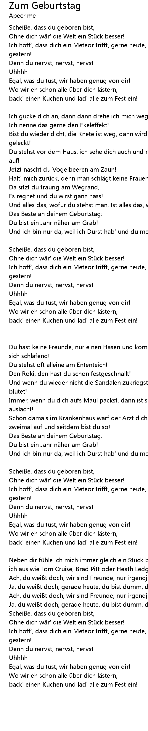 | Schon damals im Krankenhaus warf der Arzt dich dreimal hoch, doch fing' dich nur zweimal auf und seitdem bist du so! | |