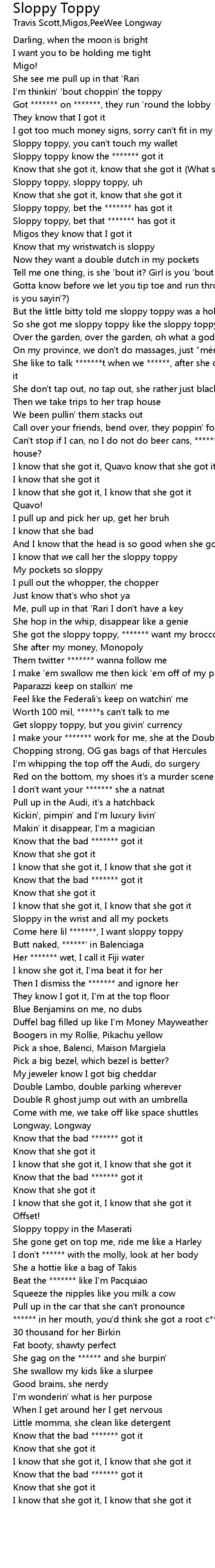 | [00:44.20] | Sloppy toppy, bet that ******* has got it |